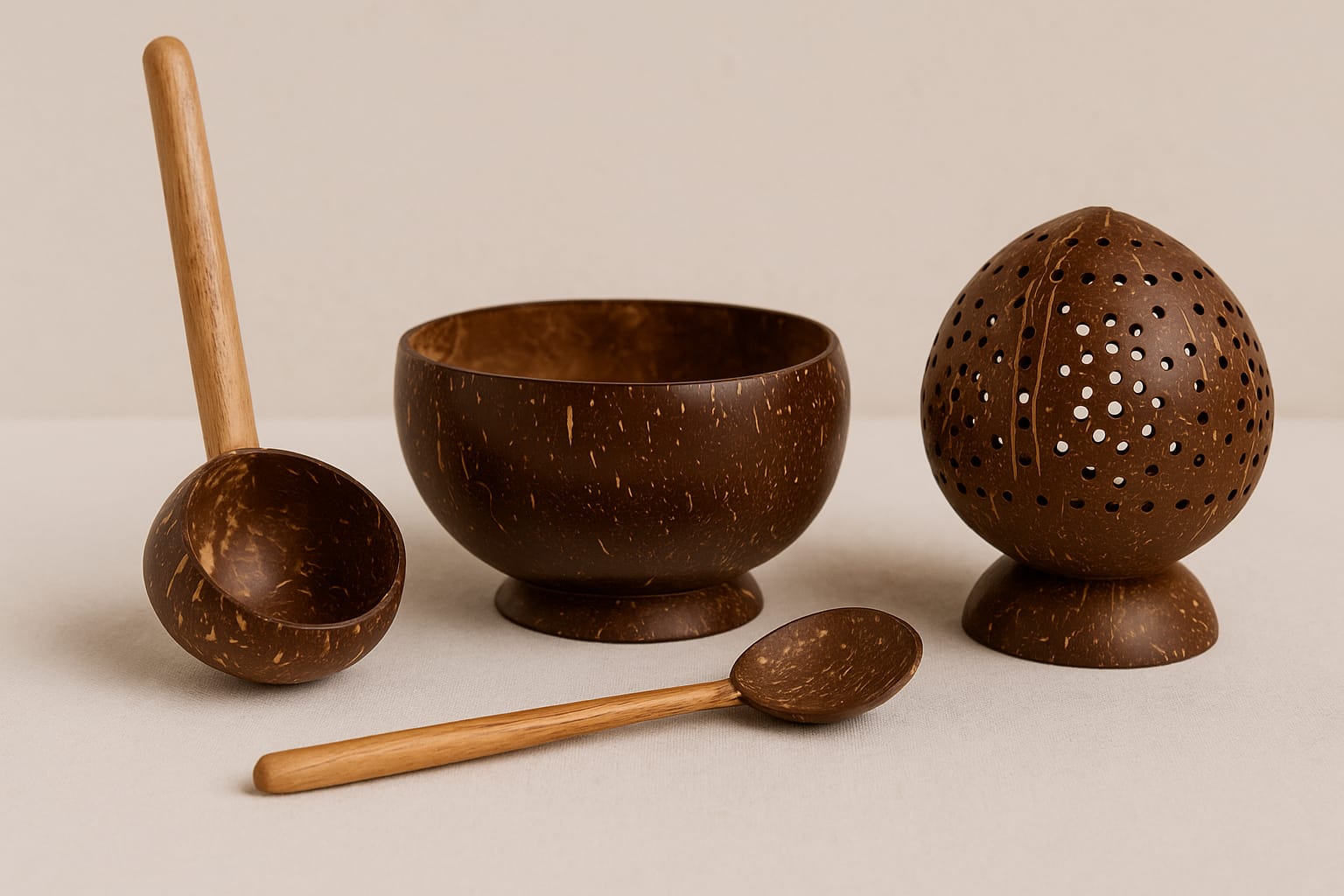 Coconut Shell Kitchenware Set – handmade from real coconut shells with smooth wooden handles. Natural, sustainable, and food-safe. Perfect for eco-conscious homes, exports, or private labels. Available in custom sets.
